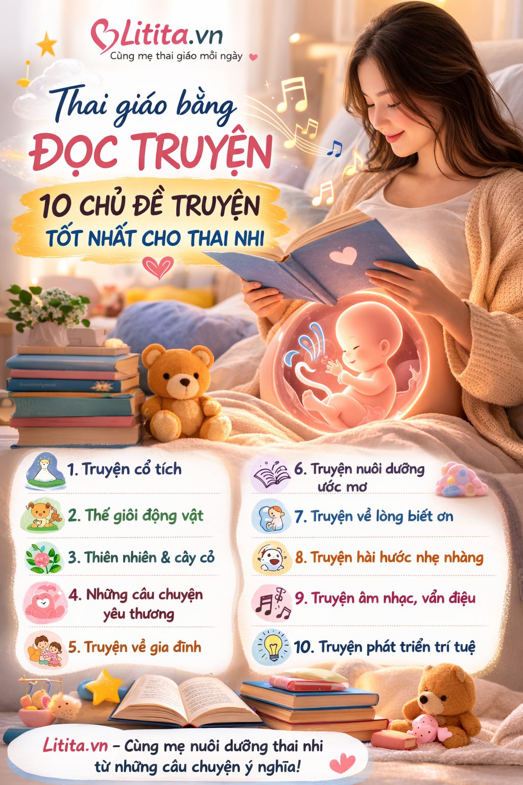 Từ tháng thứ 4, bé đã nghe rõ giọng mẹ qua nước ối. Thai giáo bằng truyện không chỉ giúp bé phát triển ngôn ngữ, trí tưởng tượng mà còn gắn kết tình mẫu tử. Tại Litita, chúng mình chọn 10 chủ đề truyện hay nhất, dễ tìm, đọc 15-20 phút/ngày với giọng ấm áp nhé!